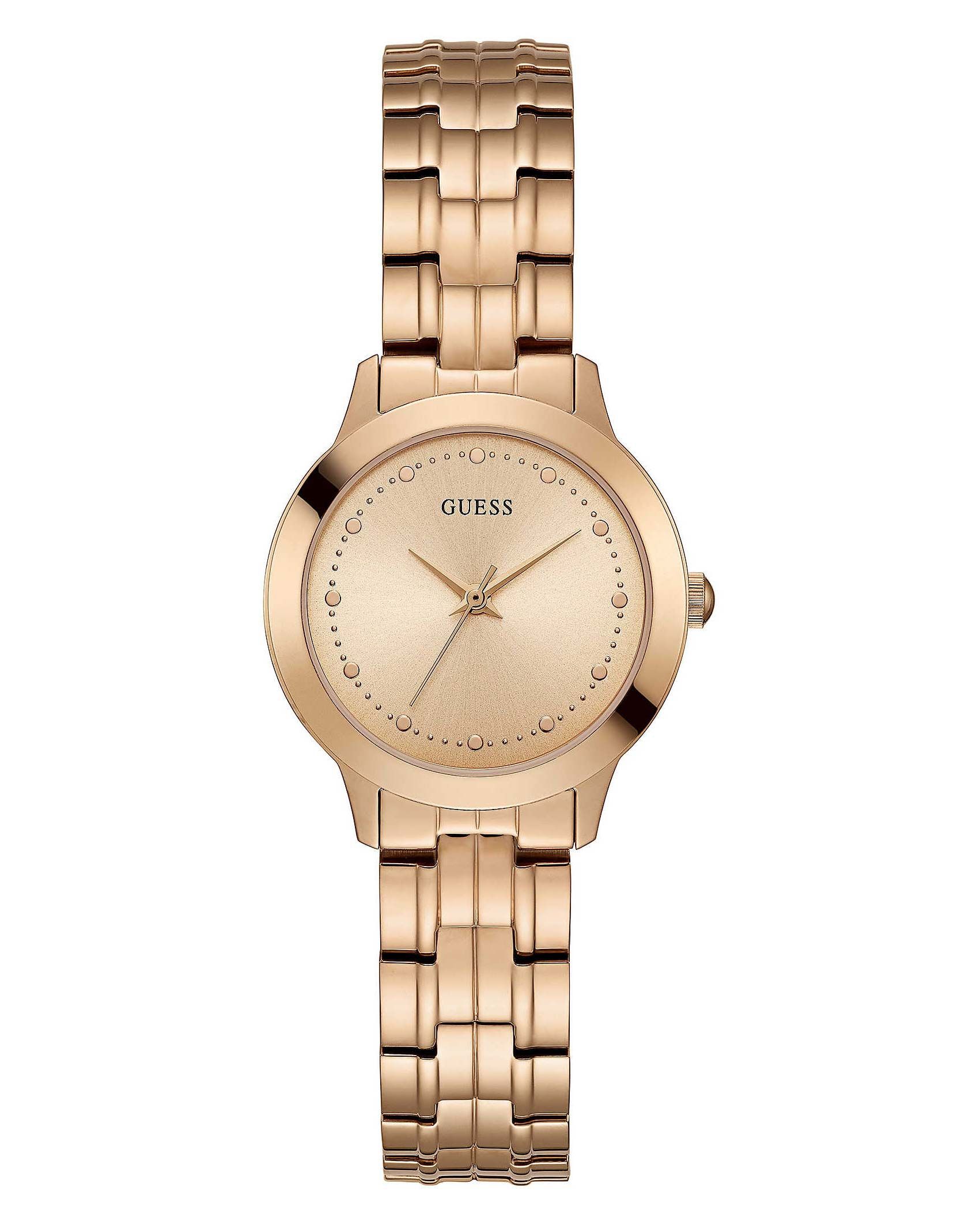 CASSA: in acciaio placcatura oro rosa di forma rotonda, à 30 mm, lunetta personalizzata, stilizzata Guess, corona lucida chiusa a pressione, vetro minerale.