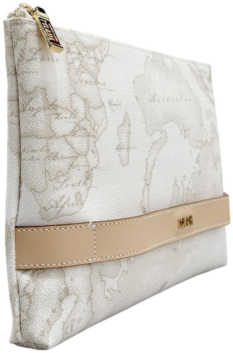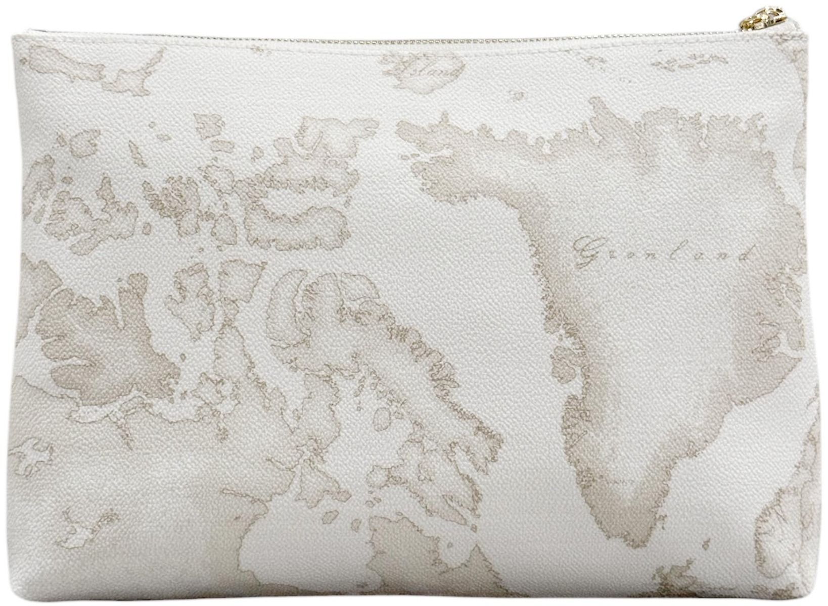 Pochette in tessuto stampato con cartina geografica Geo White con passamano in pelle di vacchetta color cuoio e chiusura con zip. Versatile e pratica da portare al polso o da riporre all'interno di un'altra borsa, presenta i dettagli accurati tipici della lavorazione Made in Italy.